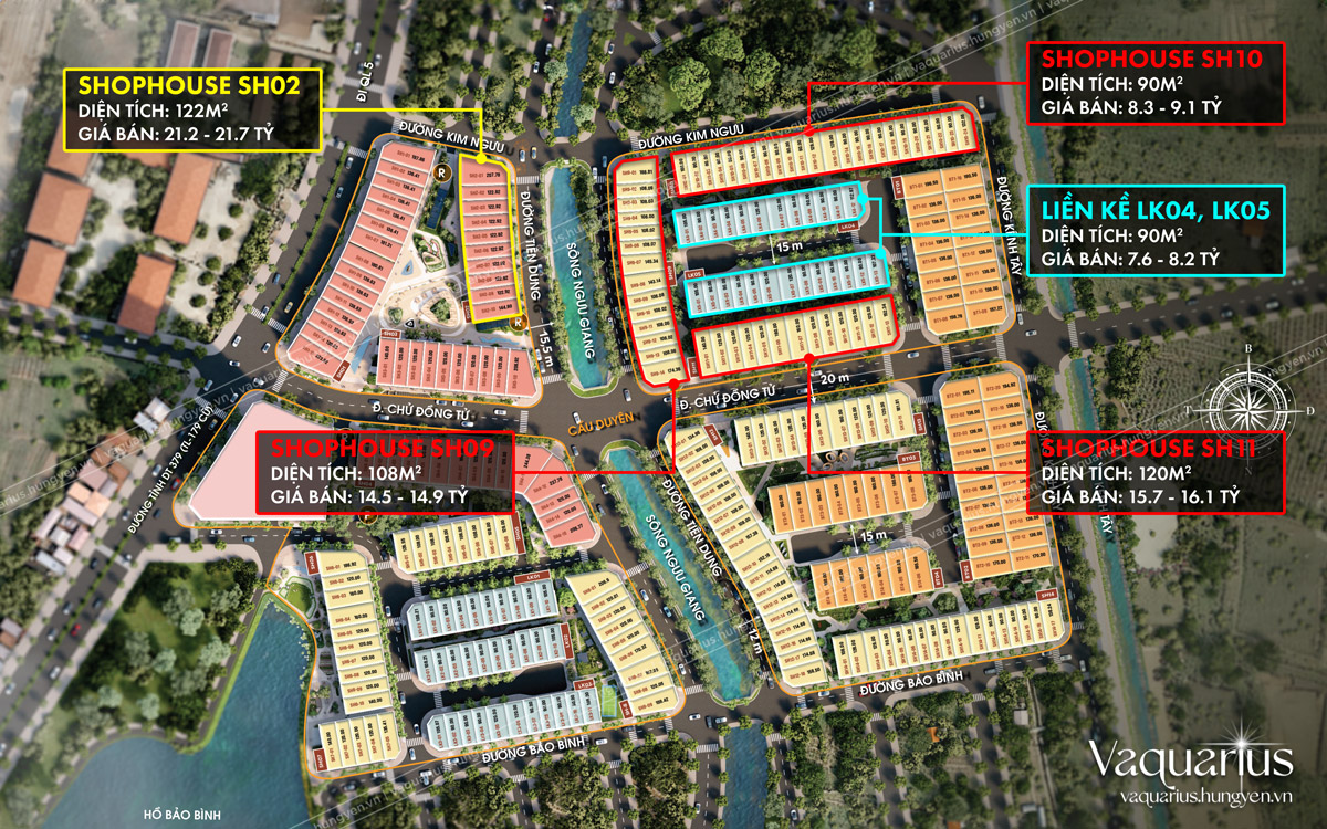 - Shophouse SH09 (đường Tiên Dung): Diện tích 108m2, Giá bán từ 14.5 đến 14.9 tỷ